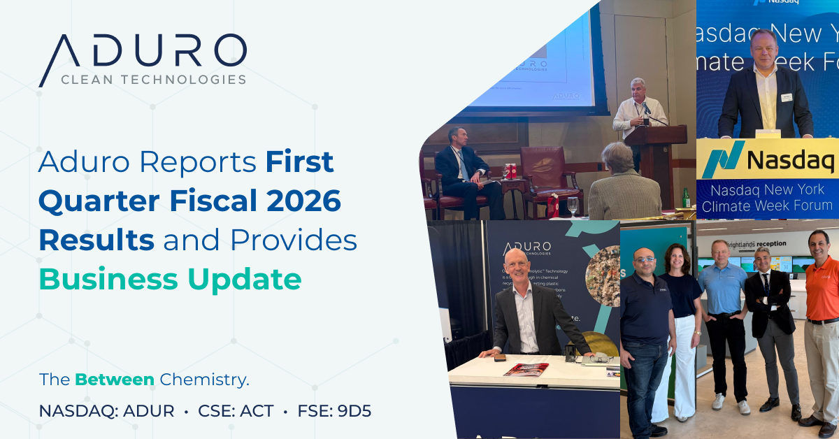 LONDON, Ontario, 17 oct. 2025 (GLOBE NEWSWIRE) -- Aduro Clean Technologies Inc., ci-après « Aduro » ou la « Société » (Nasdaq : ADUR, CSE : ACT et FSE : 9D5), une société de technologie propre qui recycle chimiquement les matières premières de moindre valeur comme les déchets plastiques, le bitume lourd ou les huiles renouvelables en ressources adaptées au XXIe siècle, publie ses résultats financiers consolidés intermédiaires condensés pour le trimestre clos le 31 août 2025, accompagnés des éclairages clés présentés ci-après. Sauf mention contraire, toutes les données financières figurant dans le présent communiqué de presse sont exprimées en dollars canadiens.